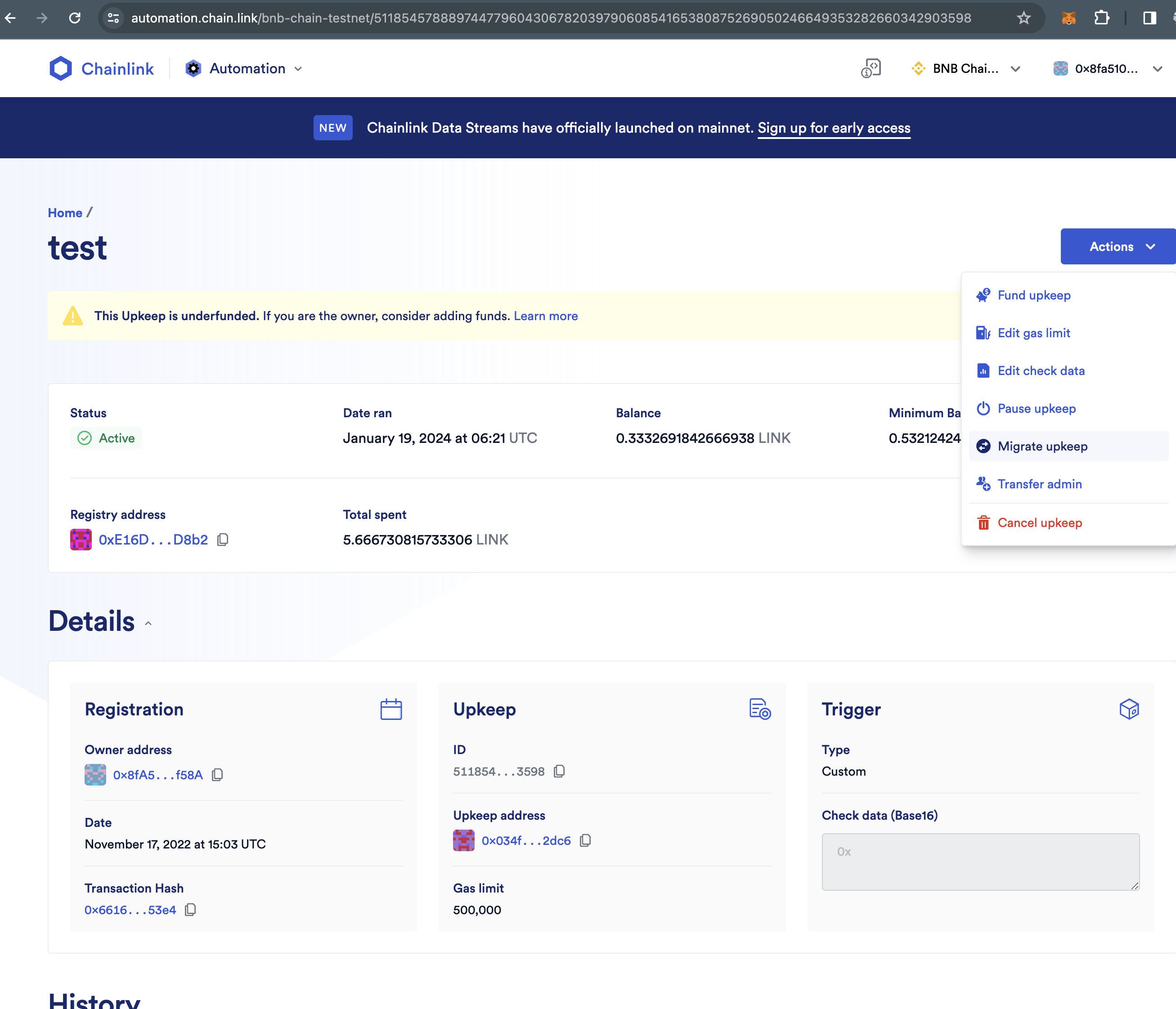 To start migrating a specific upkeep, select the upkeep. In the Details page, expand the Actions menu and select Migrate upkeep.