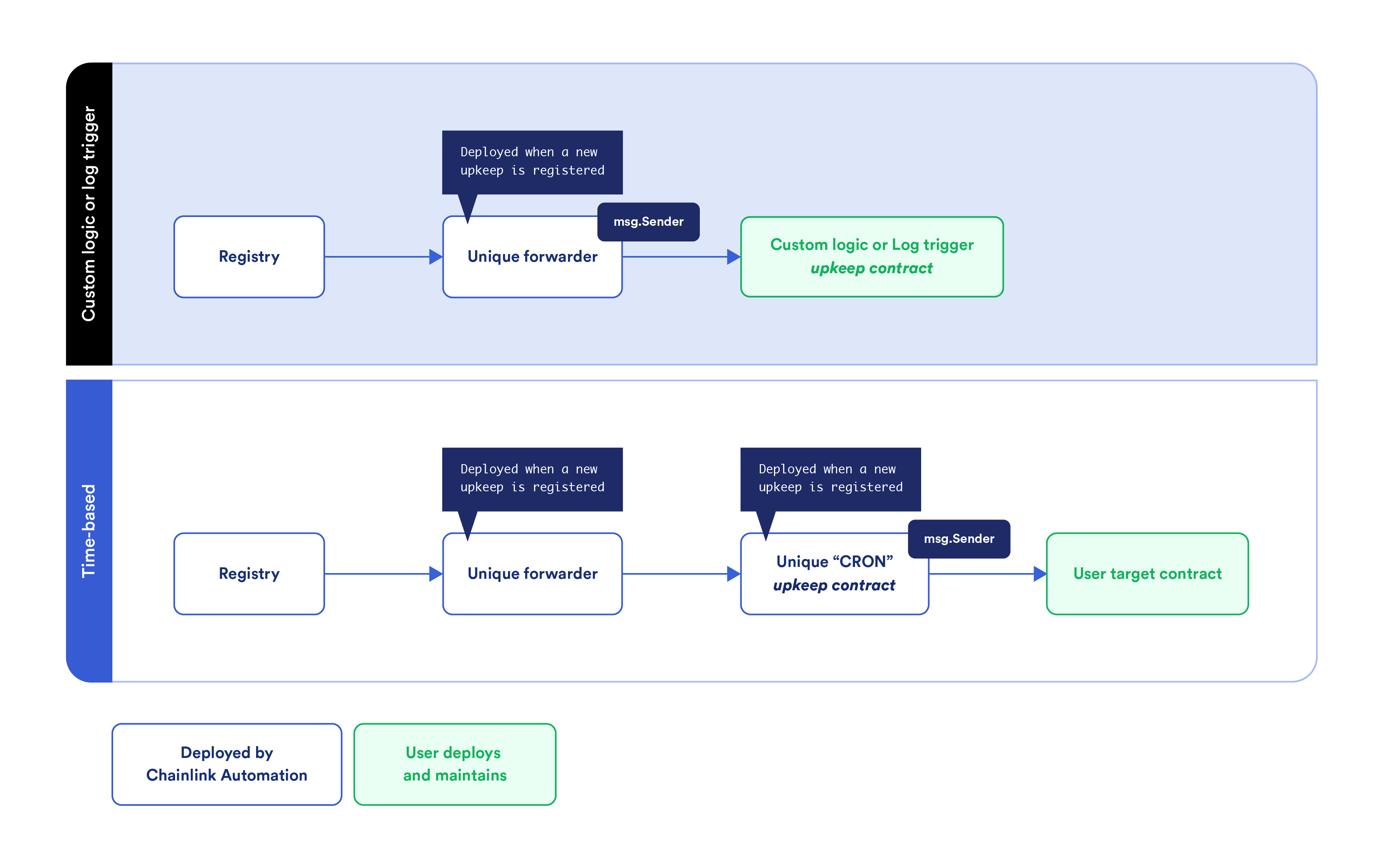 msg.senderin relation to your contract is the unique forwarder that Automation deploys when you migrate your upkeep. - For time-based upkeeps, Automation deploys a unique forwarder and a unique CRON upkeep contract. In this case, the CRON upkeep contract is the