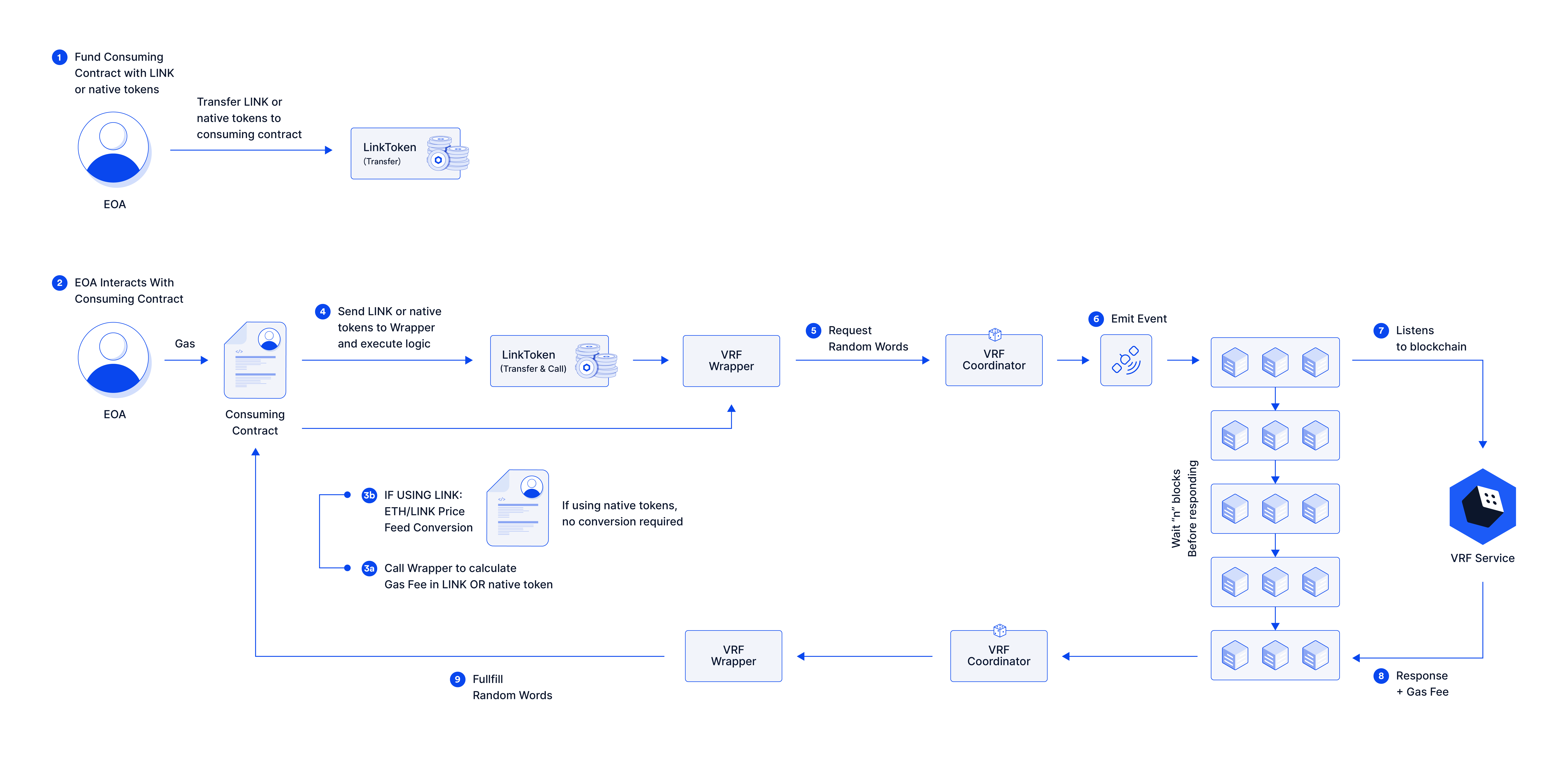 While only EOAs can initiate transactions, do not attempt to use EOAs to send VRF requests directly. Instead, your EOA should interact with your consuming contract: the smart contract that is consuming the random values you request from VRF. Your EOA initiates the transaction, and then your consuming contract interacts with the VRF Wrapper contract, which sends the VRF request.