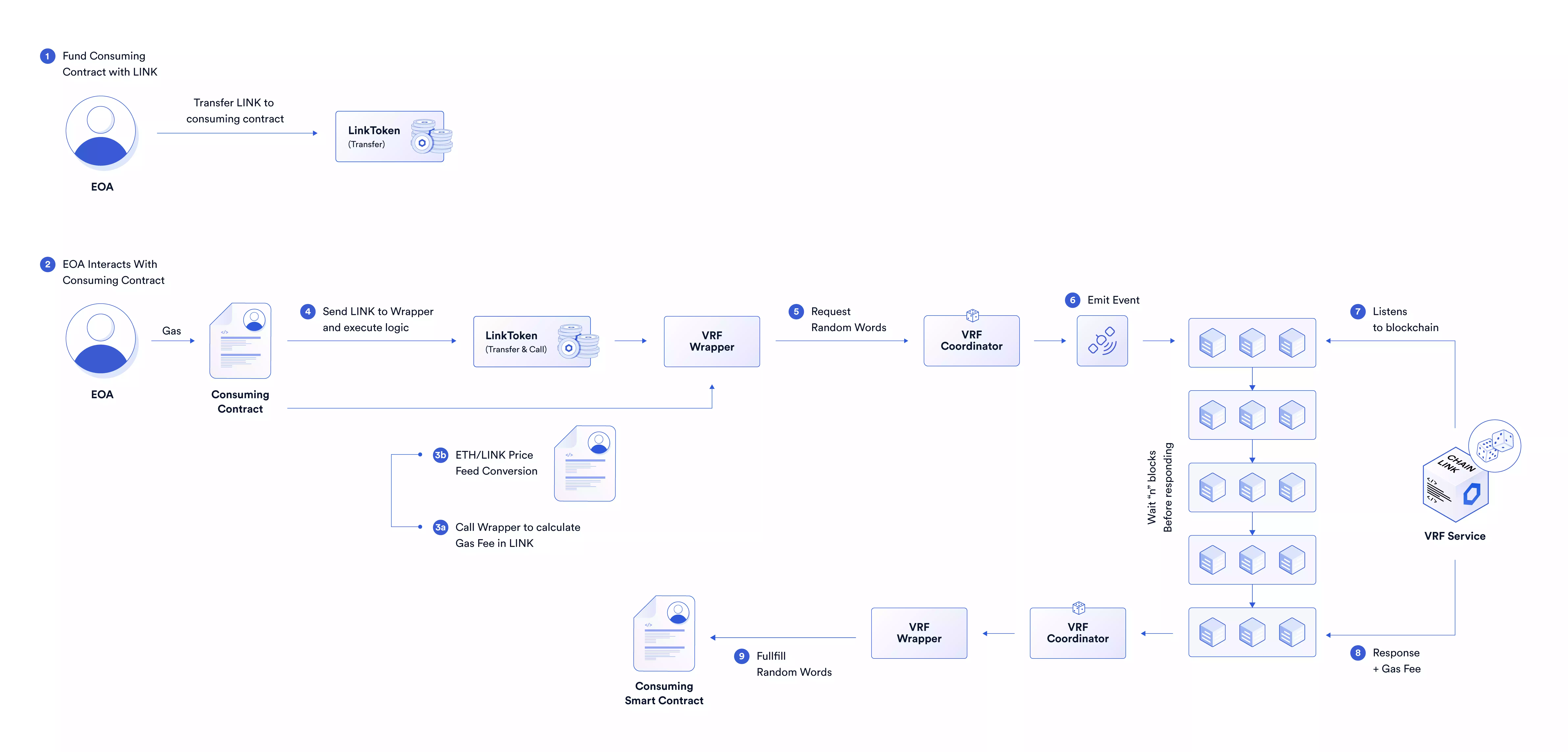 - VRF service (offchain component): Listens for requests by subscribing to the VRF Coordinator event logs and calculates a random number based on the block hash and nonce. The VRF service then sends a transaction to the